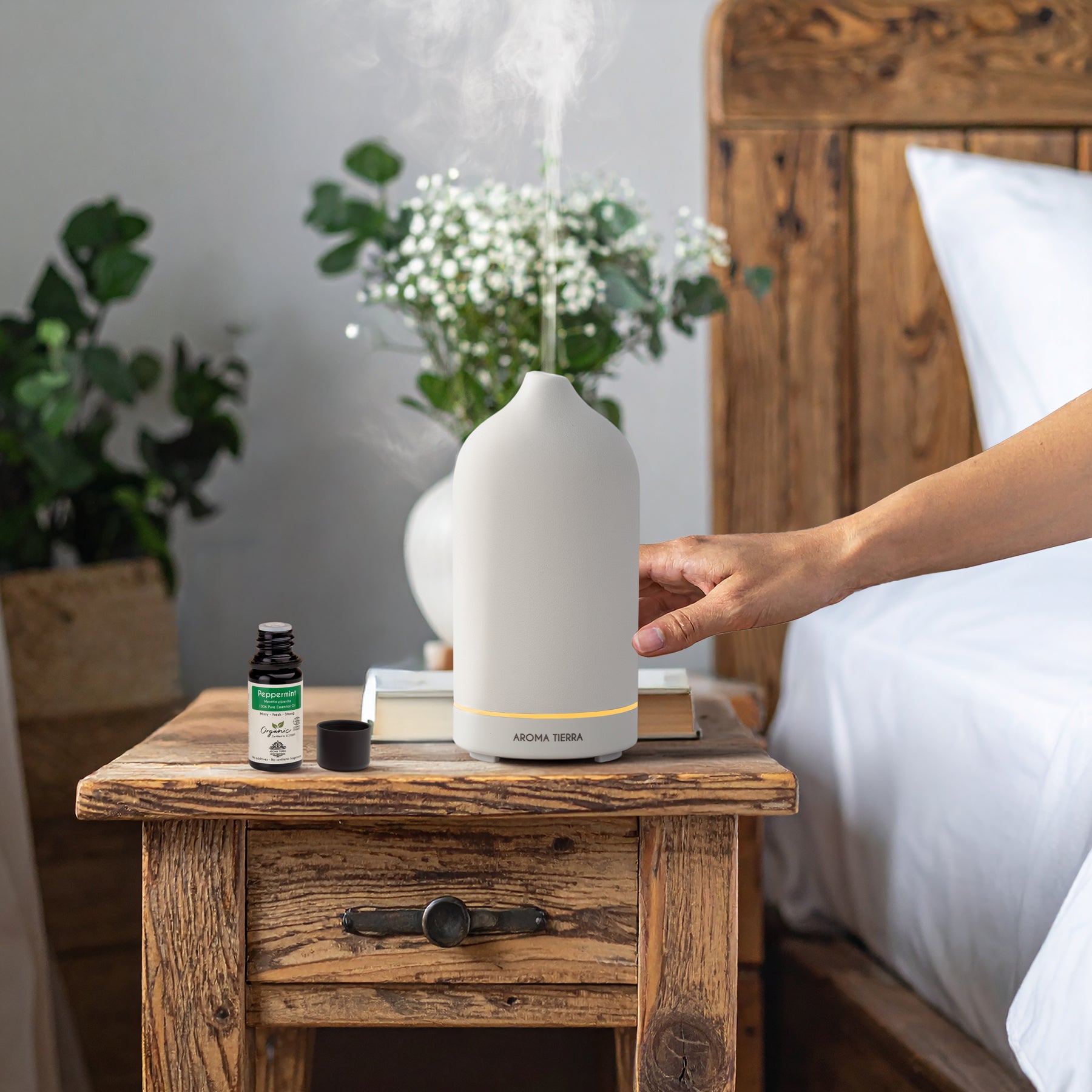 انثر 6-12 قطرة من زيت النعناع الأساسي لملء غرفتك برائحته المنشطة والمنشطة والطازجة التي سترفع من مزاجك وتعزز الطاقة وتقلل من التوتر وتحارب التعب وتعزز الأفكار الإيجابية. سيؤدي أيضًا إلى تحسين اليقظة وتسهيل التركيز وإنهاء المهمة الحالية.